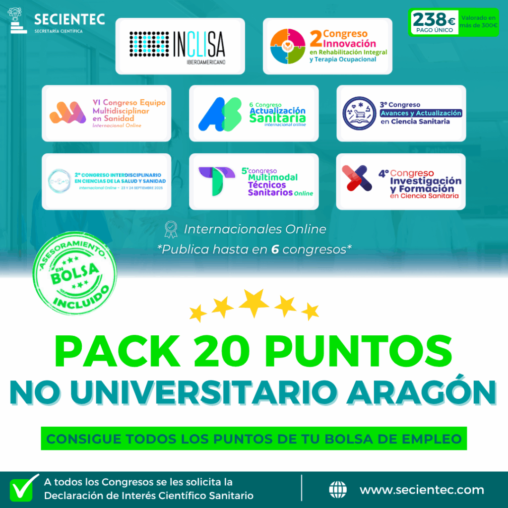 Con Secientec.com puedes conseguir AUMENTAR LOS PUNTOS de tu bolsa de empleo con comunicaciones científicas a congresos sanitarios y artículos de revista. Ahora puedes conseguir un gran descuento para conseguir aumentar los puntos en tu bolsa de empleo. Participa en hasta 6 congresos y consigue 20 PUNTOS de tu bolsa de empleo.
